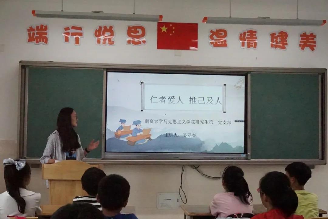 志愿服务是培育和践行社会主义核心价值观的重要载体,是建设服务型基层党组织的重要载体,是共产党员发挥先锋模范作用的重要载体。为响应党中央“参加一次志愿服务,为身边群众至少办一件实事好事”的号召,增强全体党员的奉献意识和责任意识,2021年5月27日下午,太阳成集团122ccvip研究生第一党支部部分成员前往南京市芳草园小学,面向五年级全体员工开展以“仁者爱人,推己及人”为题的志愿服务宣讲活动,带领同学们学习感悟中华优秀传统文化魅力。