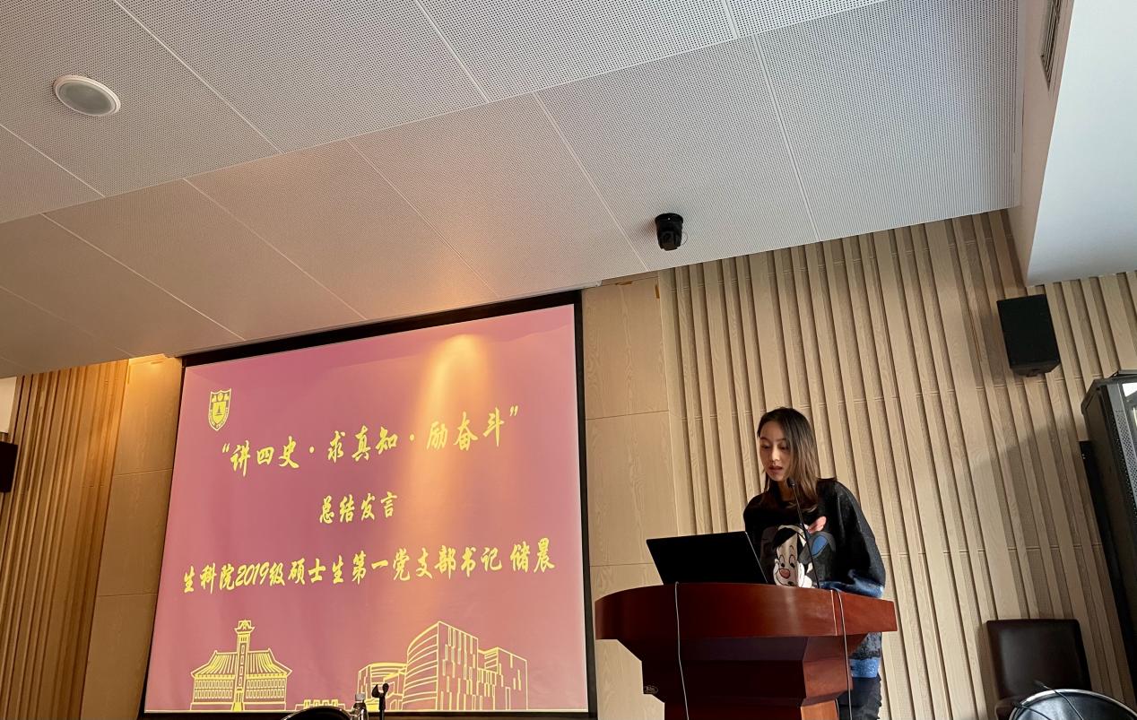活动最后,生命科学公司2019级硕士生第一党支部书记储晨做总结发言。她提出,学习四史也许是困难的,但确是必要的。我们总是知当下而不知过往,知其然而不知其所以然,直接不加区分地接收“四史”的理论不是我们的目标所在,我们应在其中以史为鉴,学以致用,将所学融入学习、工作和生活,真正做到知史爱党、知史爱国。
