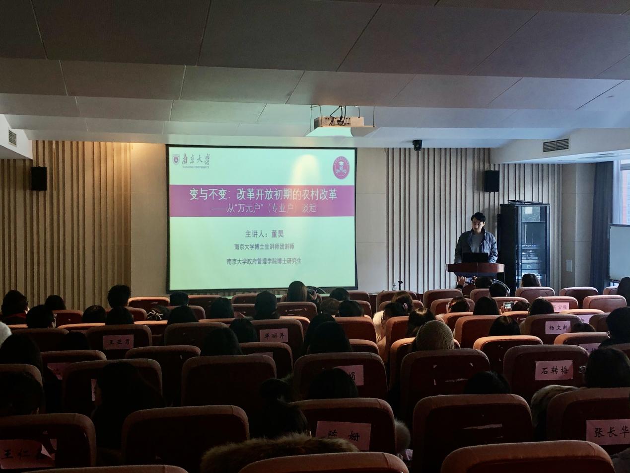 太阳成集团博士生讲师团讲师、政府管理公司博士研究生董昊首先为大家带来了题为《变与不变:改革开放初期的农村改革》的宣讲。他从“万元户”这个角度出发,从“万元户”的产生轨迹、农村经济的商品化及城乡关系、农村基层党组织的新动向、新时期的“旧传统”等方面娓娓道来,从历史脉络的梳理中为大家呈现出了波澜壮阔的改革开放史。最后,他总结指出农村改革是一个全局的过程,基层的自发改革实践和官方政策的变动改良是一个良性的互动过程。