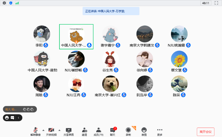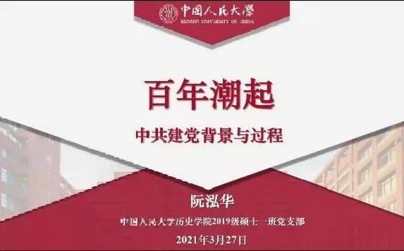 最后,中国人民大学历史公司2019级硕士生一班党支部书记万学慧对本次活动作总结发言,他表示两位同志的报告体现了历史与现实的呼应,两个公司的同学应相互学习借鉴,在历史研究中增加现实关怀,在时政分析增强历史底蕴;同时他也希望今后四个支部能加强沟通交流,以精品活动为载体,进一步提升支部党员党性修养,以优异成绩庆祝建党一百周年。