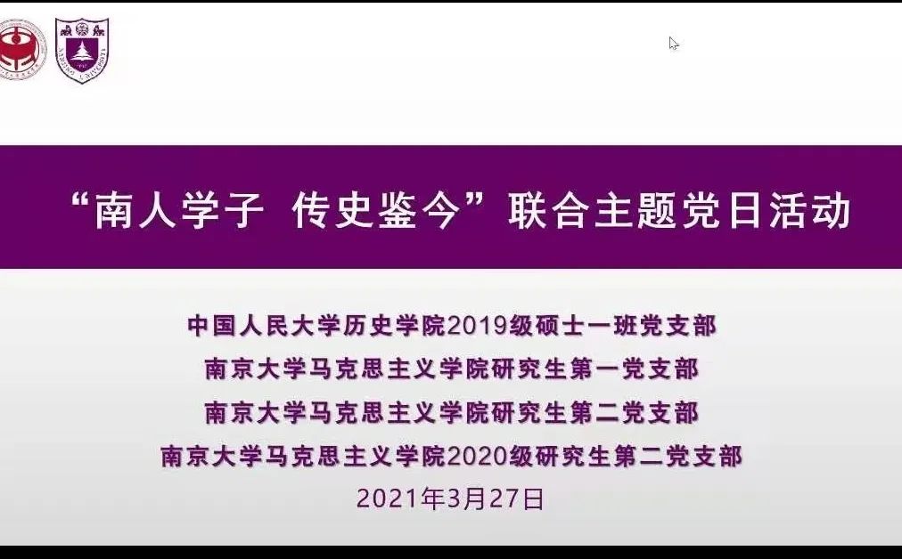 为庆祝建党100周年,进一步增强“四个意识”,坚定“四个自信”,真正做到学史明理、学史增信、学史崇德、学史力行, 3月27日晚,公司研究生第一、二党支部、2020级研究生第二党支部与中国人民大学历史公司2019级硕士生一班党支部开展“南人学子 传史鉴今”线上联合主题党日活动,公司研究生第一党支部书记崔兴红担任主持人,四个支部全体党员共同参加。