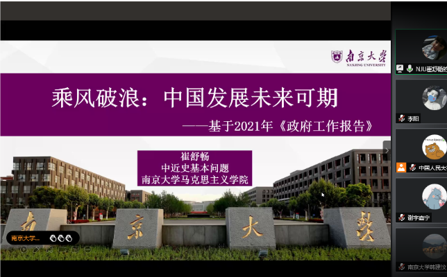 随后,公司2020级研究生崔舒畅以《乘风破浪:中国发展未来可期》为题向大家作主题报告。他从“关键词看政府工作报告”“数据统计看中国发展”“新阶段、新理念、新格局”三方面为大家简要解读两会精神,通过丰富的图表、精确的数据帮助大家明确了我国当前取得的伟大成就与面临的重大挑战,并鼓励大家要以习近平新时代中国特色社会主义思想为指导,齐心协力,开拓进取,以优异成绩庆祝党的百年华诞。