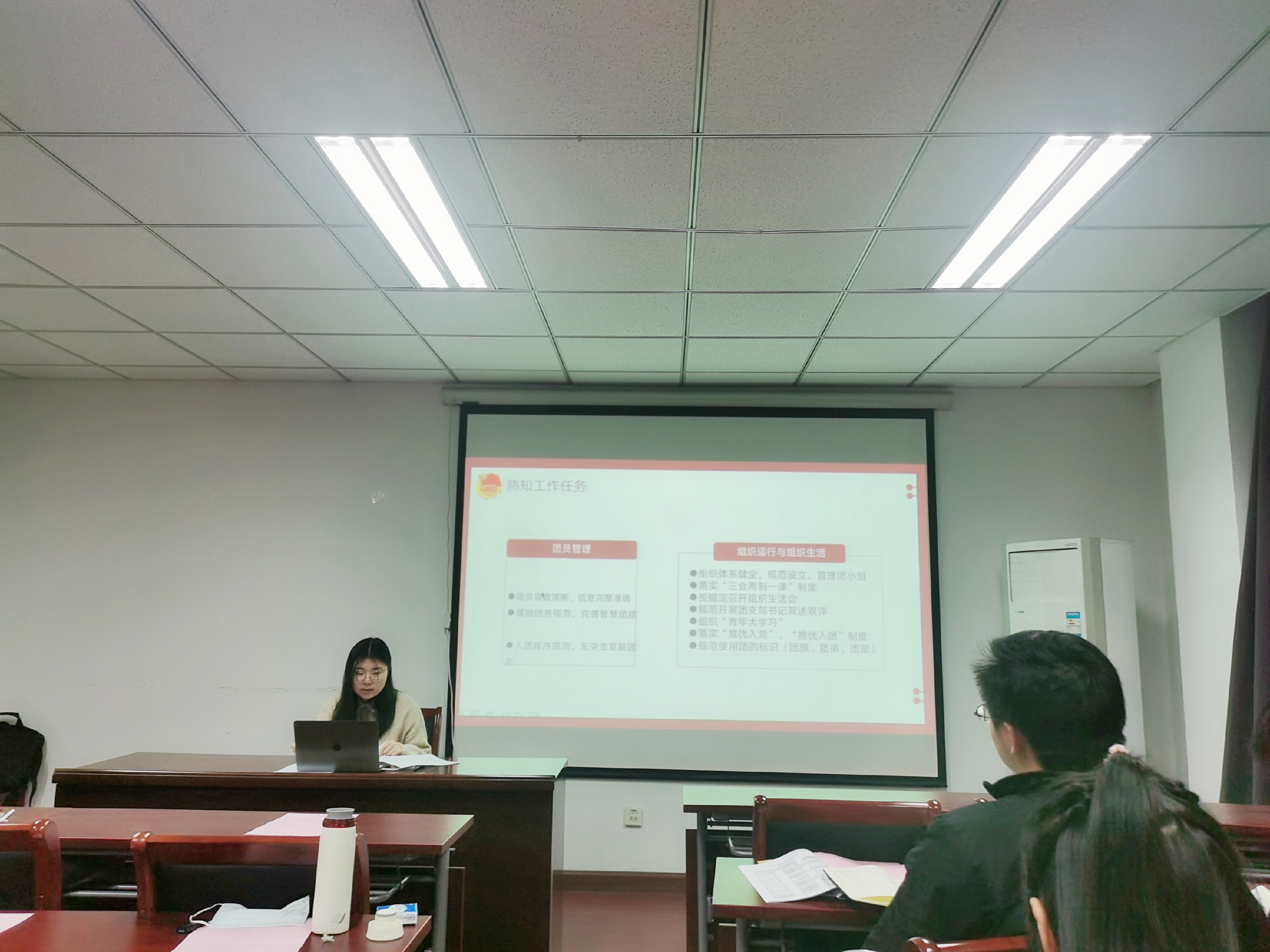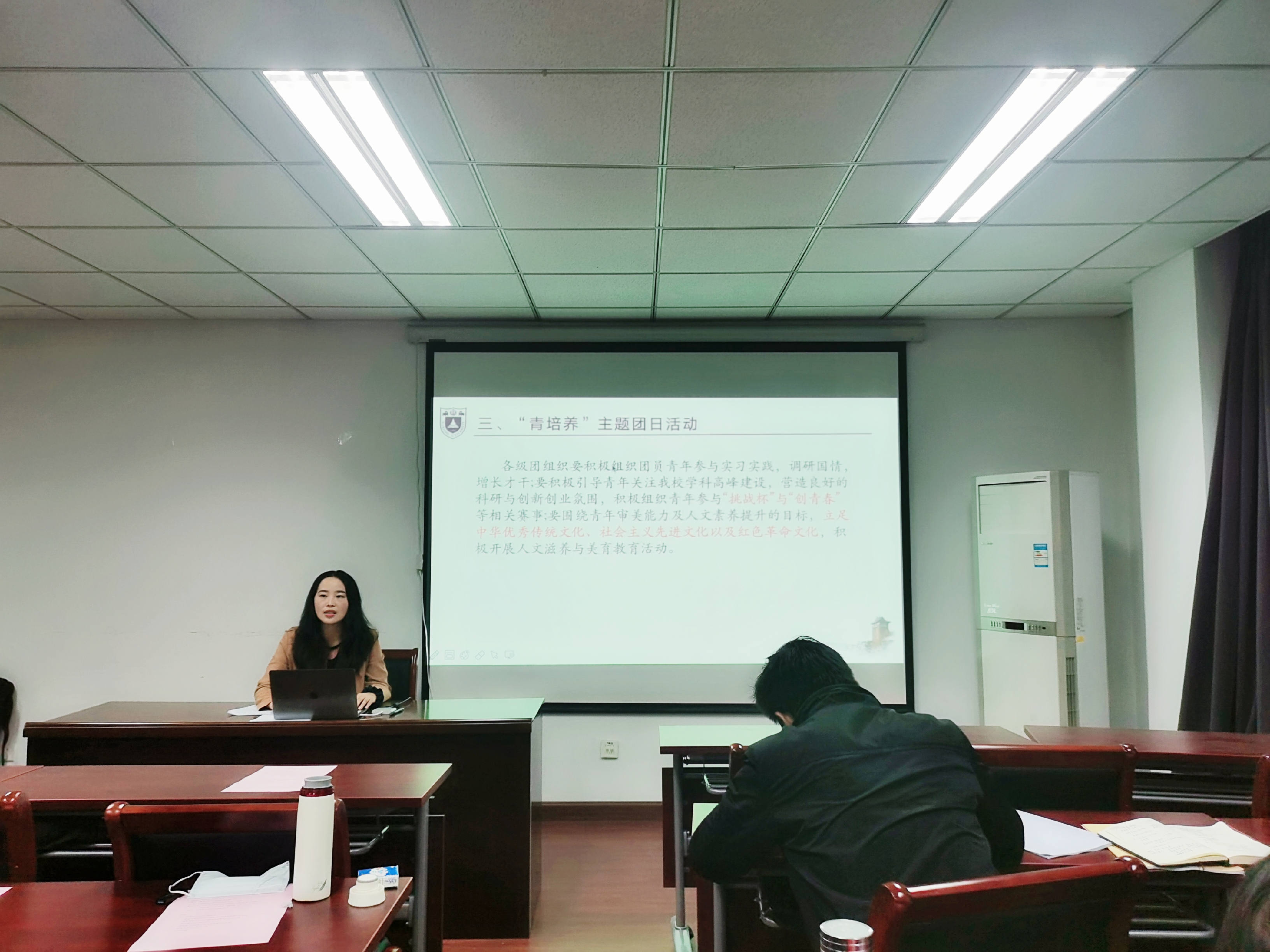 院员工团委副书记谢宇嘉宁以“凝心聚力,砥砺奋斗,在团组织建设中敢担当善作为”为题,对新学期主要团组织工作进行布置,她首先总结了近期团组织工作的开展情况,然后对“青引领”、“青组织”、“青培养”、“青服务”四项主题团日活动的开展进行了指导说明,同时号召大家极依托“学习强国”、“纽扣课堂”、“青年大学习”等学习载体,开展集学理性与趣味性相统一的团日活动,做敢担当善作为的团组织干部。