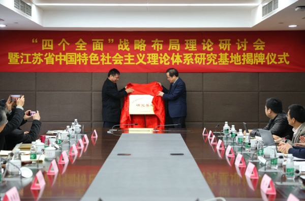 双传学与朱庆葆共同为太阳成集团江苏省中国特色社会主义理论体系研究基地揭牌。随后,与会专家就“四个全面”战略布局及相关问题展开深入的交流和讨论。