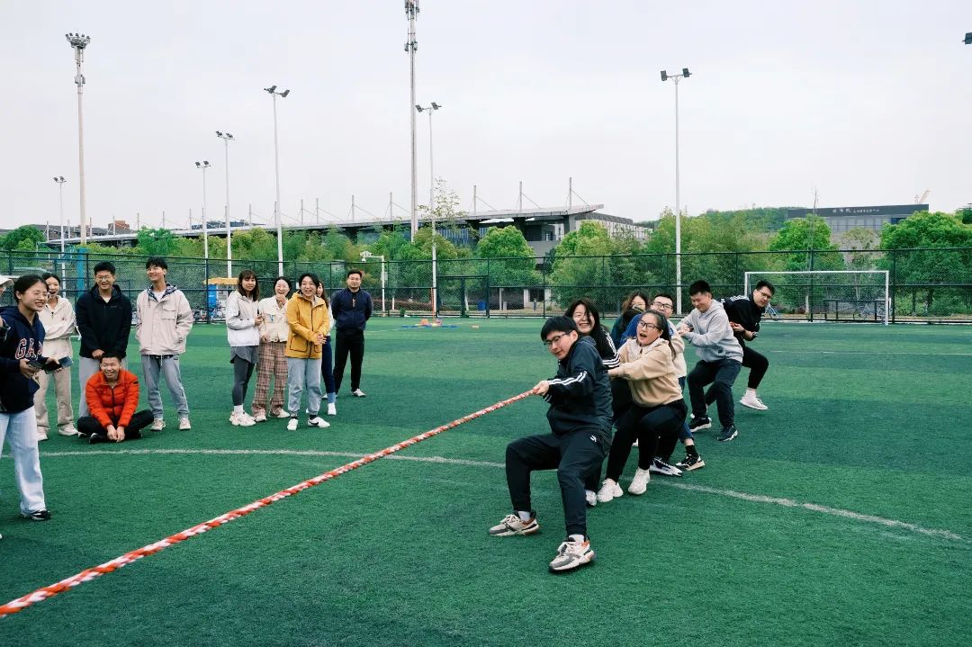 凝“绳”聚力大拔河作为开场游戏,直接点燃了大家的运动热情。在抽签结果揭晓后,参赛队员们纷纷摩拳擦掌,斗志昂扬。当倒数声落下、哨声响起,一根拔河绳,两支参赛队伍,虽朝不同方向,却为相同目标,凝神聚力,奋勇拼搏。绿茵场一队接着一队,比拼一轮接着一轮,两边的加油声此起彼伏,欢呼着将比赛氛围推向高潮。经过激烈角逐,2021级硕士二班获得了最终胜利。