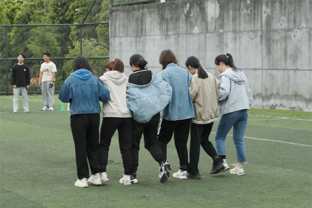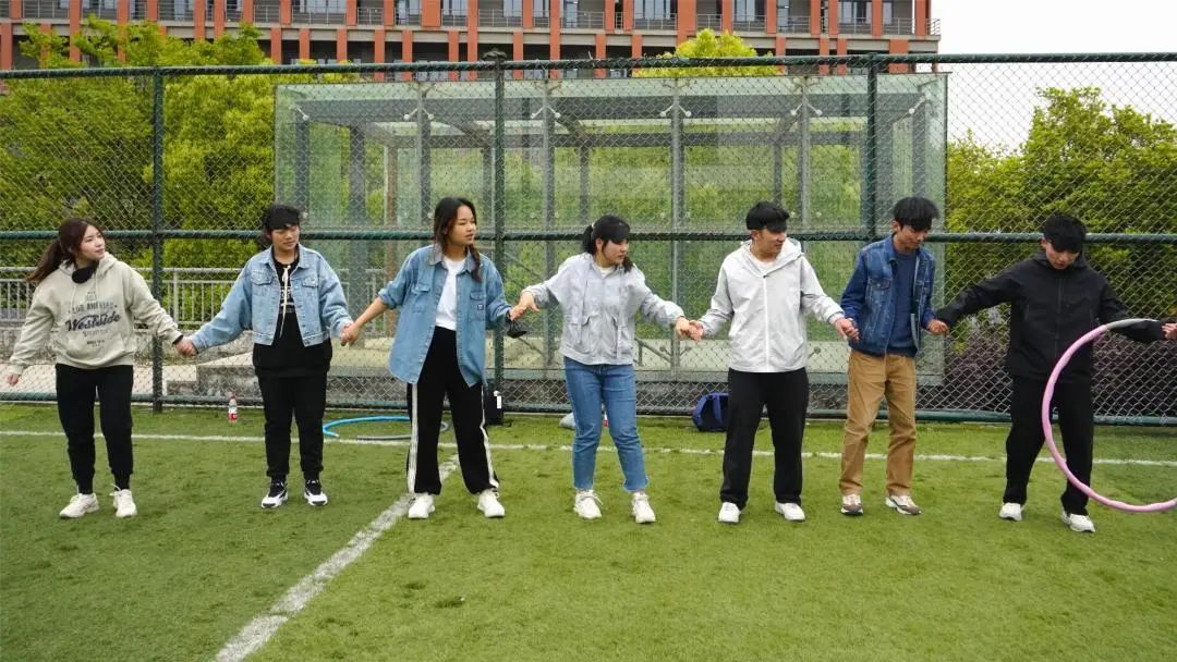 呼啦圈过山车项目一直深受同学们的喜爱,本次运动会新增“蒙眼”难度。面对“天黑”模式,同学们不但毫不畏惧,反而跃跃欲试。手拉手,心连心,传递的不是呼啦圈,而是对彼此的珍重与信任。2021级硕士一班与二班的传递用时仅差2秒,2021级硕士一班险胜一筹。
