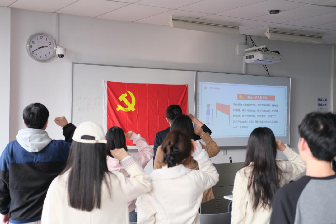 在支部副书记刘吉胜同学的带领下,全体支部成员进行了庄严的重温入党誓词——宣誓仪式。掷地有声的誓言,是中国共产党人“不忘初心,牢记使命”的庄严宣告;铿锵有力的声音是全体支部成员“踔厉奋发,勇毅前行”的号角。