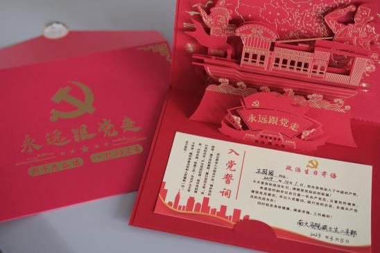 支部书记尹紫琦同学为本次过“政治生日”的同学赠送了生日贺卡。“政治生日贺卡”是党员身份的表征,是党性意识的载体;贺卡的赠送,传递着人文的交流;庄重的仪式,指引着前进的方向。