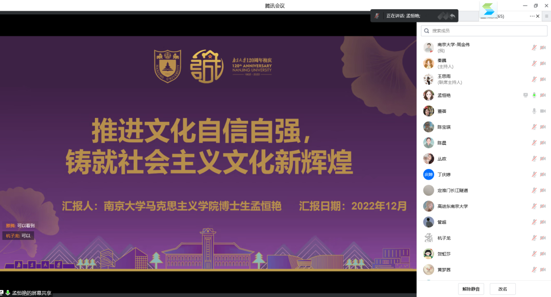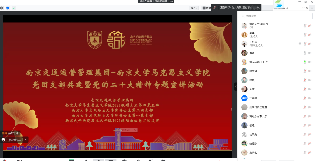 为深入学习贯彻党的二十大精神,更好让公司研究生党团员发挥专业优势服务地方发展,12月23日上午,公司2021级硕士生第二党支部、博士生第一党支部、博士生第二团支部、2021级硕士生第二团支部与南京交通运营管理集团(以下简称:运管集团)以线上形式开展了党团支部共建暨党的二十大精神专题宣讲活动,双方单位60余名党团员青年相聚云端参加本次活动。活动分共建合作和专题宣讲两个环节,分别由运管集团党群工作部主任、团总支书记董蓓和公司博士研究生周金伟同学主持。