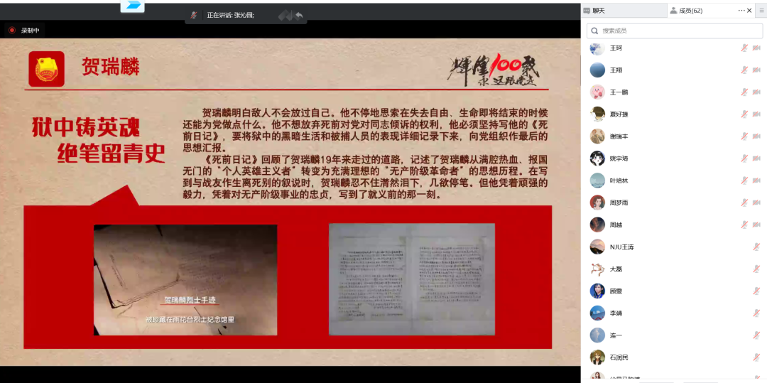 公司硕士研究生、青年宣讲团成员张沁园同学带来《南京青年团和雨花英烈精神》的主题宣讲。她以南京青年团史为主线,借助丰富的图文史料,声情并茂地讲述了雨花英烈贺瑞麟烈士的革命英雄事迹,展现了南京青年团组织在敌人封锁压迫中发展壮大的不朽历程,彰显了“两高一大”的雨花英烈精神,突出了在新时代新征程坚定历史自信、增强历史主动的重要意义。