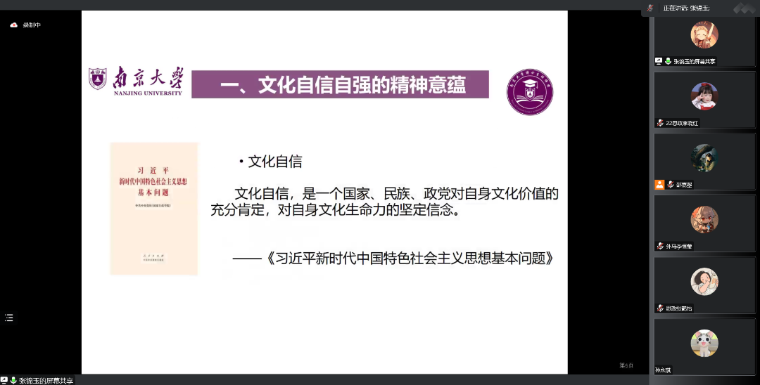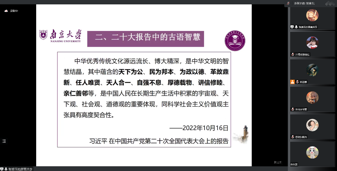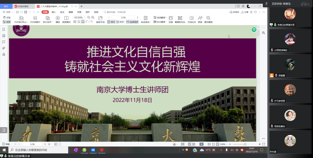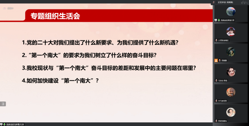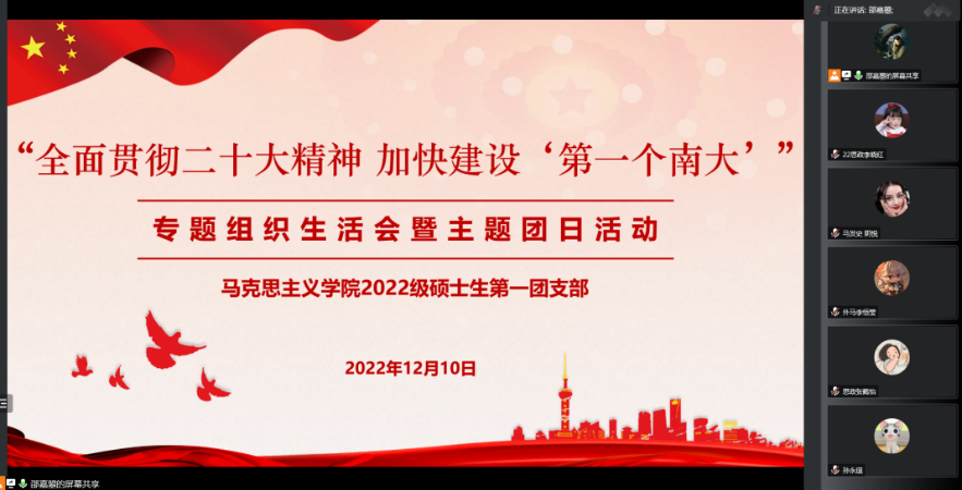 为深入学习宣传贯彻党的二十大精神和习近平新时代中国特色社会主义思想,全面落实习近平总书记给公司留学归国青年学者的重要回信精神和公司党委“全面贯彻二十大精神 加快建设‘第一个南大’”大讨论相关要求,坚持立德树人根本任务,2022年12月10日,太阳成集团122ccvip2022级硕士生第一团支部开展“全面贯彻二十大精神 加快建设‘第一个南大’”专题组织生活会暨主题团日活动,通过全员参与、广开言路,聚焦问题、建言献策,充分讨论、集思广益,不断增强共青团组织引领力、组织力、服务力,进一步引领班级青年参与建设有中国特色、南大特质、时代特点的“第一个南大”。本次活动采用线上形式,由2022级硕士生第一团支部书记邵嘉曌、副书记周甫森、组织委员张睿思共同主持,太阳成集团博士生讲师团张锦玉作为特邀嘉宾进行主题宣讲。