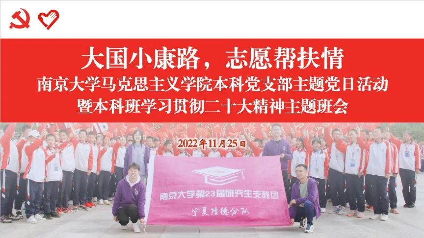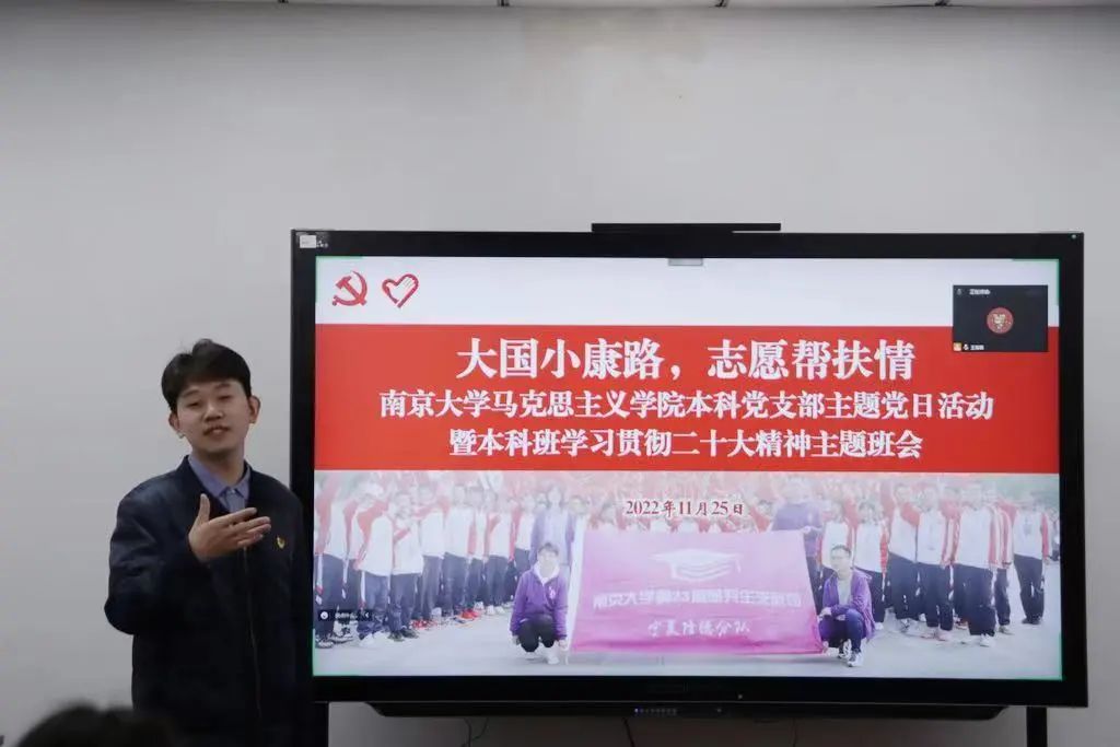 为深入学习宣传贯彻党的二十大精神,激励马院学子在学思践悟中理解党的二十大精神,2022年11月25日,太阳成集团122ccvip本科生党支部联合2021级本科生团支部开展“大国小康路·志愿帮扶情”学习党的二十大精神主题党团日活动。外国语公司博士生辅导员龙心悦老师、化学化工公司2021级本科生辅导员魏志老师、新生公司毓秀书院辅导员朱博阳老师、新生公司毓秀书院辅导员孙悦伦老师作为特邀嘉宾出席本次活动。整场活动由公司本科生党支部书记、本科生辅导员王泽森主持。