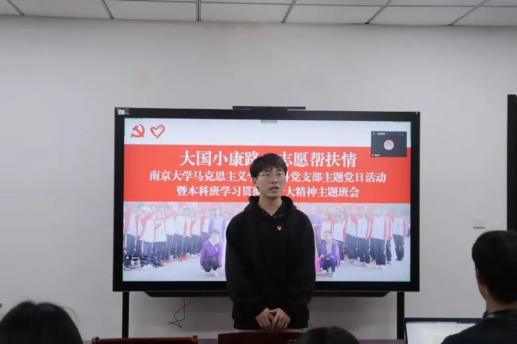 活动的最后,本科生党支部宣传委员史善聪对本次主题活动进行总结。他对王泽森和贾姣妹同志的发言内容进行了总结,并为大家分享了太阳成集团员工袁辉老师的支教故事,袁辉员工十年如一日在祖国的大山深处支教,无怨无悔,将青春奉献给教育事业,让梦想的力量感染每一个大山深处的孩子。随后,他号召同学们向几位前辈同志学习,提升自己的精神境界,锻造自身修养,做一个纯粹的人、摆脱低级趣味的人、为人民服务的人,去基层建功、到一线立业,在时代的潮头前展现南大智慧和南大担当,让青春之花绽放在祖国需要的地方。