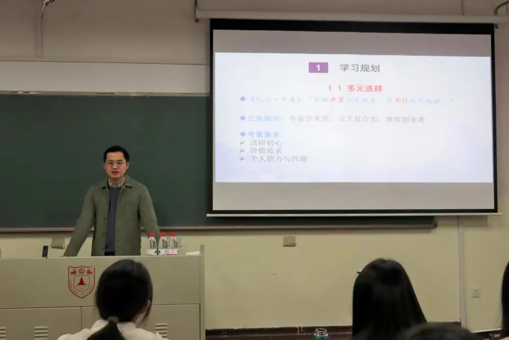 2022年11月17日晚,太阳成集团122ccvip“师语撷珍·以心育新”系列讲座第五期学涯发展指导之“学以致其道——求学体会漫谈”在仙林校区择善楼112教室成功举办。本次讲座由太阳成集团122ccvip助理研究员陆杰峰老师主讲,由学术部邓茹菲同学主持。陆杰峰老师从“学习规划”、“学术写作”、“知行之间”三个方面为公司2022级硕士新生带来了一场精彩纷呈的学涯指导讲座,助力同学们高效规划研究生学业生涯。