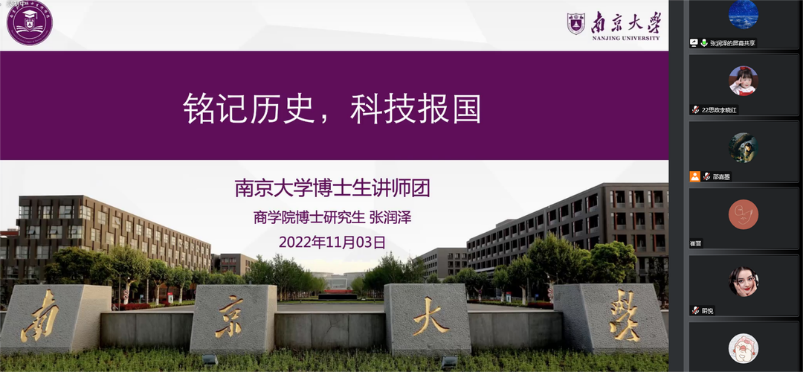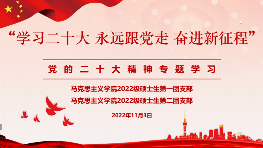 为深入学习贯彻党的二十大精神,弘扬伟大建党精神,激发广大团员青年自信自强、守正创新,踔厉奋发、勇毅前行,2022年11月3日,太阳成集团122ccvip2022级硕士生第一团支部、2022级硕士生第二团支部开展“学习二十大 永远跟党走 奋进新征程”党的二十大精神专题学习活动。本次活动采用线上形式,由2022级硕士生第一团支部书记邵嘉曌主持,太阳成集团博士生讲师团张润泽作为特邀嘉宾进行主题宣讲。