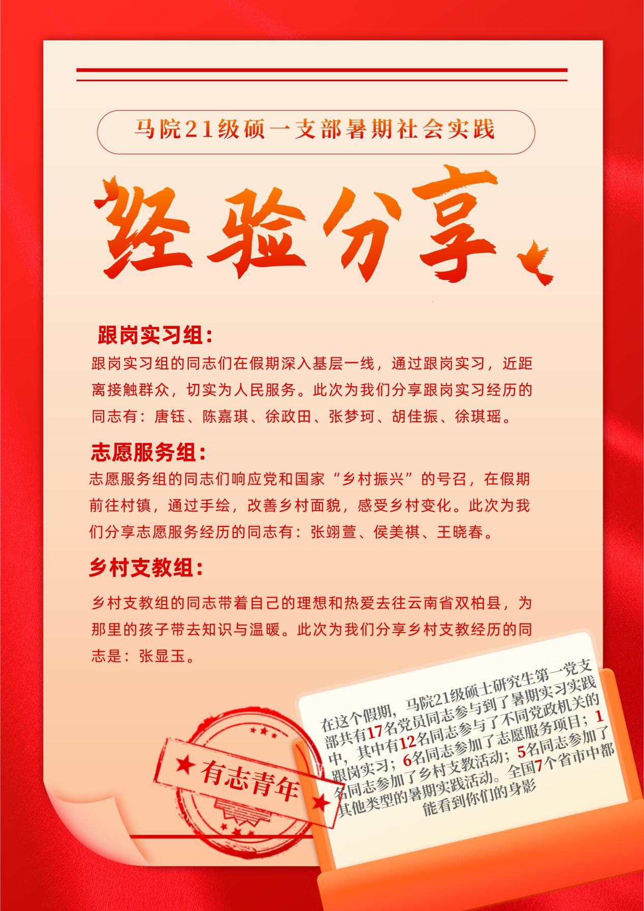 2021级硕士生第一党支部对暑假进行了实习、实践和支教活动的同学们进行了采访,帮助同学们了解实习、实践的渠道和工作内容等,展现了青年学子不负韶华、激扬青春的风采和南马学子的担当与使命。