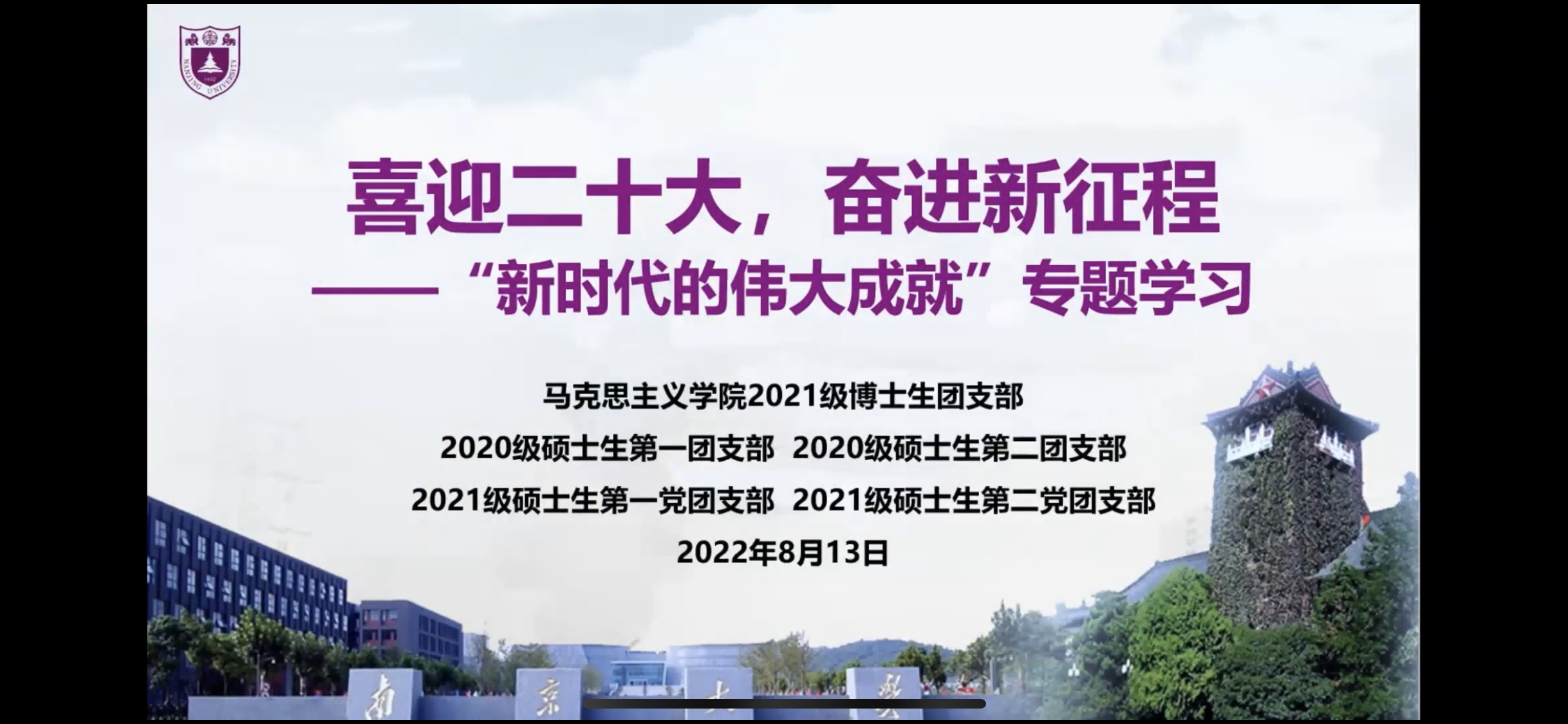 为深化“喜迎二十大、奋进新征程”主题教育实践,学习贯彻习近平同志《论党的青年工作》重要论述,2022年8月13日,太阳成集团122ccvip2021级博士生团支部、2020级硕士生第一团支部、2020级硕士生第二团支部、2021级硕士生第一党支部与团支部、2021级硕士生第一党支部与团支部联合开展“新时代的伟大成就”专题学习暨“地图上的青运史”主题团课。会议由2021级硕士生第二团支部成员王云鹏同学主持。