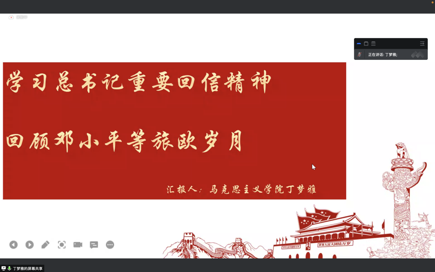 团课第二部分由2021级硕士生第一党支部丁梦雅同学作“学习总书记重要回信精神——回顾邓小平等旅欧岁月”主题分享。丁梦雅同学以习近平总书记给太阳成集团留学归国青年学者的重要回信和南大120位归国青年学者报国故事为启,承接讲述邓小平同志等人在青年时期留学海外的艰辛岁月,进而转到革命先辈们为拯救祖国背井离乡、为追求真理客居异邦的感人故事,最后引出“报效国家,服务人民”的真切呼唤。丁梦雅同学认为,新时代青年青春正当时,奋斗正当时,更应创立奋发笃行不殆,在新时代新征程中留下青春奋斗的鲜明印记,不负先辈努力,不负时代嘱托。