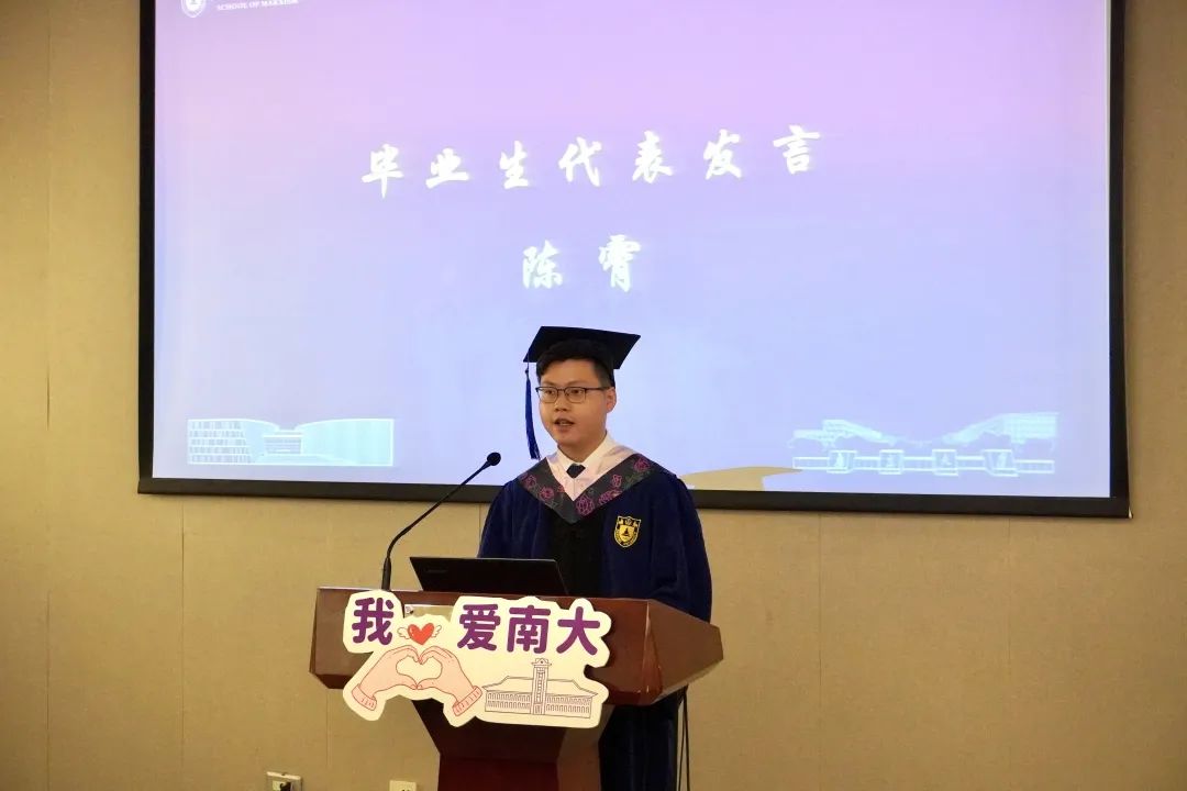 2019级中国近现代史基本问题研究专业硕士研究生陈霄作为2022届毕业生代表发言。陈霄带领大家重温了在南马的三年珍贵时光,“记得破冰时的才艺表演,铭记各位老师不厌其烦的教导呵护、参加公司组织的学术氛围浓烈、员工活动热烈的各项活动,在重要历史阶段参与为党献礼的微党课视频、微党课大赛”。人生最苦离别,值此韶华,不如迈向未来。最后他代表全体毕业生做出庄严承诺,必学有所成,不负师恩;迈步前行,砥砺奋进;扎根基层,报效国家!