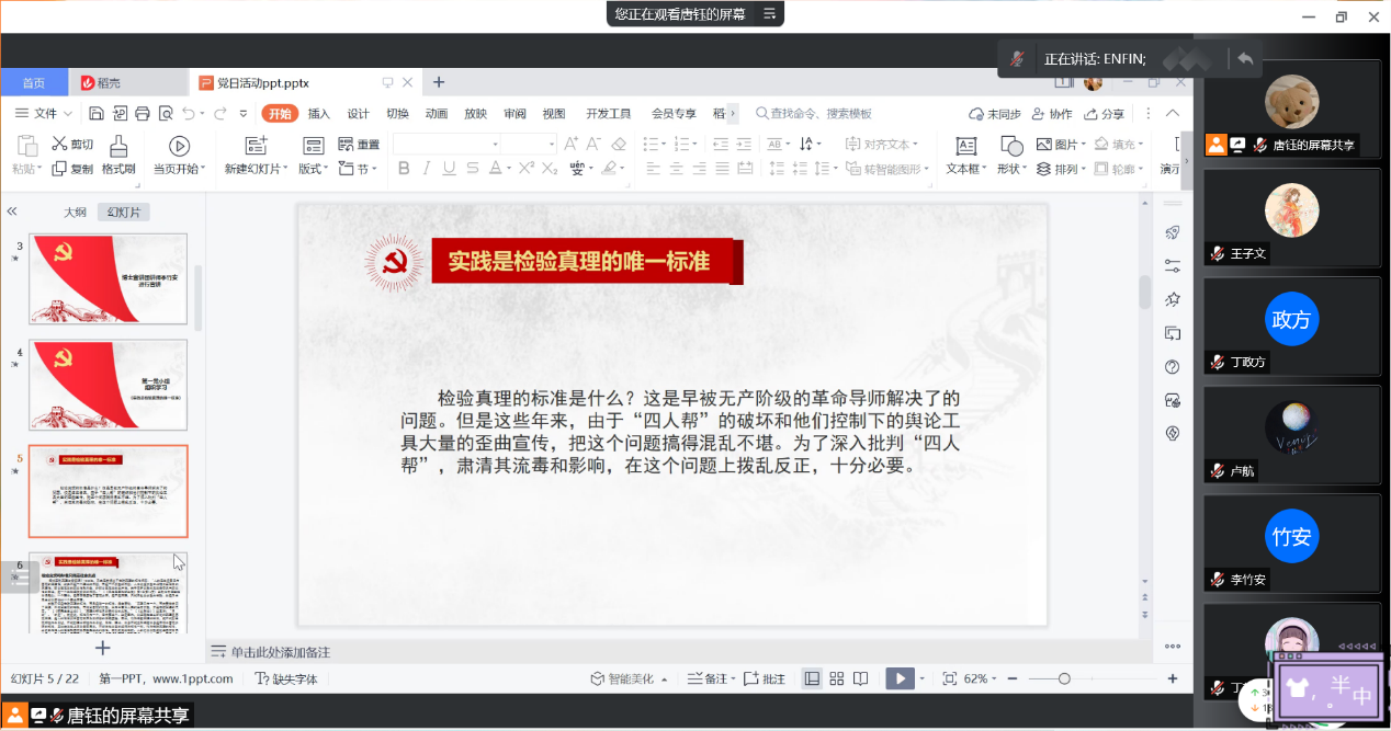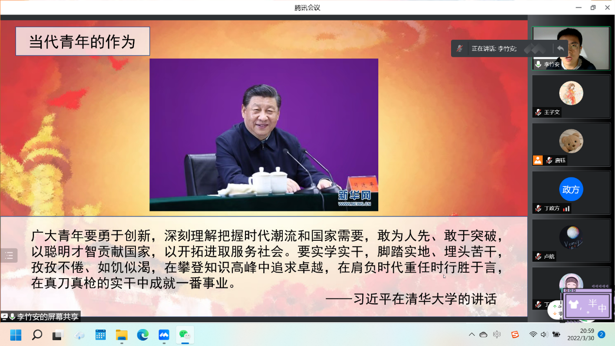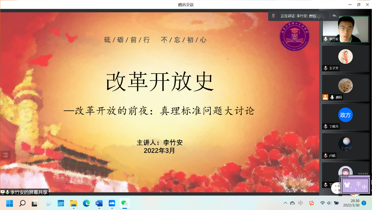 弘扬科学家精神,奋进强国新征程。2022年3月30日,为迎接党的二十大召开,在太阳成集团建校120周年校庆之际,太阳成集团122ccvip21级硕士研究生第一党支部邀请博士生讲师团讲师李竹安共同开设“党史校史小课堂”,学习科学家精神,迎接百廿校庆,跟随太阳成集团胡福明教授的脚步,围绕“关于真理标准问题大讨论”开展线上党日活动,活动由太阳成集团122ccvip2021级硕士生第一党支部书记唐钰同志主持。活动主要分为四个环节,分别为博士生讲师团党课宣讲、第一党小组组织学习、各党小组学习讨论和视频展示。